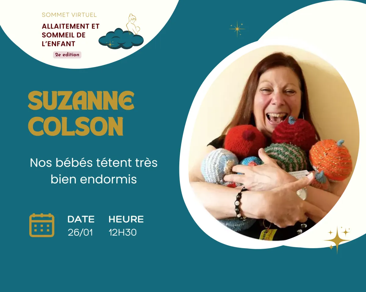Suzanne Colson est sage-femme, chercheuse en lactation humaine et une figure internationale de l’allaitement. Elle a consacré plus de 35 ans à la recherche, à l’enseignement et à l’accompagnement des mères allaitantes, et est connue pour avoir développé l’approche du Biological Nurturing (allaitement instinctif), qui met en lumière la capacité naturelle des mères à allaiter dans un cadre biologique et spontané.